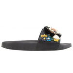 Dazzle in the epitome of summertime luxury with these Dolce & Gabbana rubber slippers. Adorned with an exotic iguana print and crafted from the finest calfskin, they boast intricate papier-mâché embellishments, delicate flowers, and vibrant jewels, ensuring every step you take is a statement. Perfect for fashion-forward trendsetters who love to stand out. Add a splash of bold sophistication to your wardrobe with these Italian masterpieces.