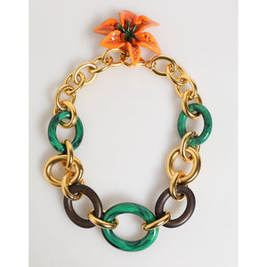 Gorgeous brand new with tags and box, 100% Authentic Dolce & Gabbana statement necklace. This unique design features chunky interlinked chains in gold-tone brass, marbled green resin, and dark wood-tone accents. The highlight is the bold orange tiger lily flower clasp, hand-painted for a striking and artistic finish. A standout couture piece that adds drama and elegance to any outfit.