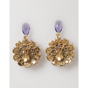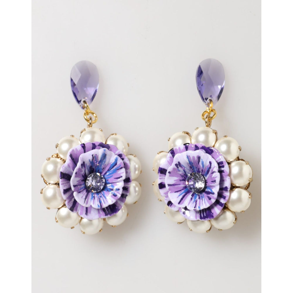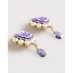 • Dolce & Gabbana Purple Floral Crystal Pearl Drop Clip-On Statement Earrings