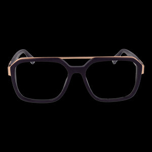 • GUESS MOD. GU50138 55082 vintage-style gent's eyeglasses with dark frame and gold accents, front view against black background.